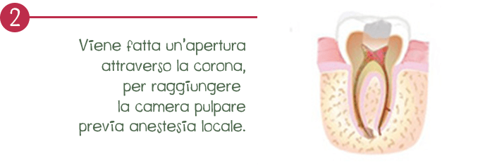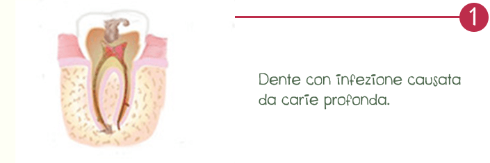 Quando il dente è danneggiato da carie profonde, traumi o altre cause, i batteri e le loro tossine possono penetrare nella polpa dentale provocando un’infiammazione che può essere molto dolorosa (pulpite) e portare a perdita di vitalità del dente. Se questa situazione non viene trattata con una cura canalare, può formarsi un’infezione alla punta della radice, accompagnata da dolore e gonfiore (ascesso).