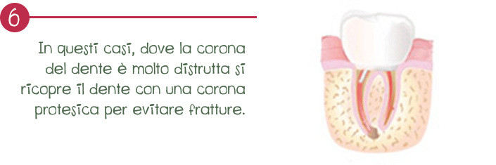 Un dente trattato con la cura canalare è più fragile di un dente vitale, per cui molto spesso richiede di essere ricoperto con una corona protesica (capsula) per evitare fratture.