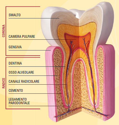 è il soffice tessuto che contiene i vasi sanguigni e il tessuto connettivo e nervoso del dente. La corona (la parte di dente visibile sopra la gengiva) contine la camera pulpare che si sviluppa attraverso il canale radicolare fino all’apice della radice. I denti anteriori di solito hanno una sola radice e un solo canale, i premolari uno o due radici e tre canali. I molari hanno normalmente due o tre radici e tre o quattro canali.